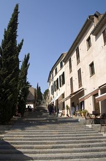 Tour Nr. 6 - Mittlere Serra de TramuntanaAls erstes Ziel für diesen Tag stand Valldemossa auf dem Programm. Wir fuhren zuerst über die Autobahn nach Palma und dann direkt auf der Landstraße dorthin. Bereits am Eingang erwartete uns ein pittoreskes Dorf mit netten Häusern, einer ausgiebigen Fußgängerzone und viel schattenspendendem Grün. Wir sahen uns die Häuser an und kamen auch an die Kartause von Valldemossa, wo der Komponist Chopin und die Schriftstellerin George Sand ihre Liebschaft pflegten. Das dortige Museum ließen wir aus, da uns der Eintrittspreis von EUR 8,50 pro Person ein bisschen happig erschien. Nächste Station war der Künstlerort Deiá. Auch dieses Städtchen zeigt sich malerisch an einem Hang gelegen und so liefen wir dort bergauf und bergab um die netten Häuser und die Kirche am oberen Berg zu erreichen. In der Stadt sollen weltberühmte Persönlichkeiten ihr (Ferien-) Domizil haben, doch gesehen haben wir keine davon. Wir machten danach den vorher mühsam ergatterten Parkplatz wieder frei und fuhren weiter nach Sóller. Dort angekommen fielen wir fast förmlich über die Trambahngleise, die mitten über den Placa Constitucio laufen. An diesem Platz besichtigten wir zuerst die Kirche und suchten danach eine der zahlreich vorhandenen Bars auf, um unser Mittagessen zu ordern. Während wir vor dem Lokal saßen fuhr des Öfteren die Trambahn von und nach Port de Sóller an uns vorbei. Anschließend gingen wir zum Bahnhof der Stadt und konnten dort den Roten Blitz bewundern, in den gerade Passagiere für die Fahrt nach Palma einstiegen. Bei Betrachtung des Betriebshofes für Eisenbahn und Trambahn hat man das Gefühl, die Zeit sei hier vor 30 oder 40 Jahren stehen geblieben. Dieses Gefühl wurden wir auch nicht los, als wir durch die Straßen von Sóller bummelten. Die Stadt gibt sich wohl bewusst ländlich bodenständig und wirkt dabei recht sympathisch. Wir verzichteten darauf, mit der Trambahn nach Port de Sóller zu fahren und verwendeten stattdessen unser Auto. Auch dieser Hafenort machte auf uns einen bewusst altmodisch gehaltenen Eindruck und liegt in einer sehr schönen Bucht. Nach diesem kurzen Stopp fuhren wir weiter nach Fornalutx. Dieses Dorf ist sicher einer der schönsten Orte Mallorcas und so besichtigten wir die Gassen, Treppen und schöne Häuser, bergauf und bergab laufend. Auf dem Rückweg fuhren wir durch den gebührenpflichtigen Tunnel nach Palma und von dort aus auf der Autobahn nach Camp de Mar.